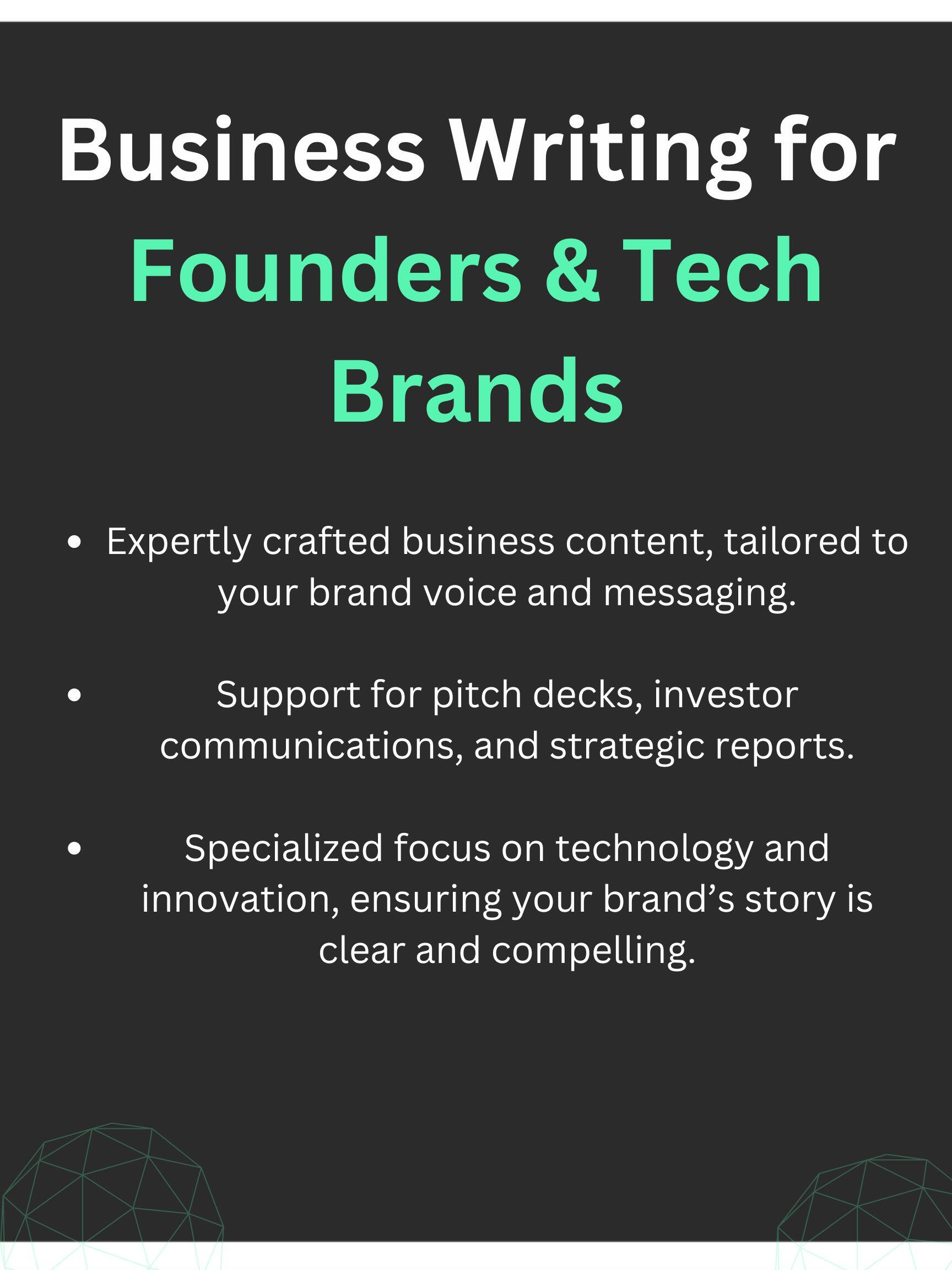 Your time is valuable, and crafting compelling, high-quality business content takes expertise and time. With the Business Writing for Founders & Tech Brands service, you can focus on your core strengths while I handle the messaging. Whether it’s pitch decks, investor communications, or strategic reports, I’ll ensure your brand’s story is clear, professional, and tailored to your audience.Is there a limit to how much work gets done?